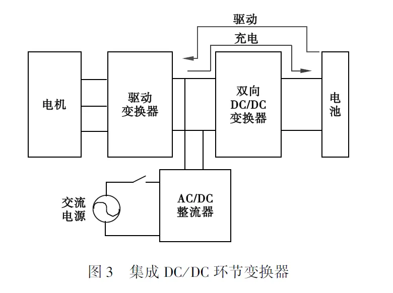 图3给出了集成DC/DC环节充电系统的结构图,在该类方案中,不需要对驱动电路进行重构,通过增加一部分功率器件,将DC/DC变换器改造为双向变换器来实现驱动与充电功能,相比传统的车载充电器,系统的体积、重量、成本有所降低。但是在充电模式下需要增加整流电路来实现交直流转换。