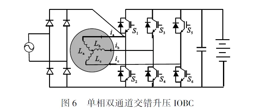 文献中提出的IOBC将单相电压整流成直流电压后,再增加一级由三相永磁同步电机定子绕组和驱动电路桥臂,构成双通道交错升压DC/DC变换器,如图6所示。在驱动模式下,电池通过驱动变换器为电机提供电压,此时附加的二极管桥并不会对驱动模式的运行产生影响。在充电模式下,交流电压由二极管桥整流后,通过电机绕组与驱动变换器一起构成的DC/DC变换器为电池充电,其中永磁同步电机的定子绕组充当滤波电感。在这种情况下,流经电机定子绕组的电流关系为ia=-2ib=–2ic,当转子的d轴与a轴重合,此时定子合成磁场与转子磁场方向一致,转子受到的电磁力位于a轴方向,保证其在充电过程中不会产生电磁转矩。其中输入电流总谐波失真率为3.96%,两级结构的存在导致充电效率不高,最大效率为93.1%。文献在此基础上提出的单相集成充电器可以实现降压DC/DC和升压DC/DC功能。但同时增加三个继电器,导致系统可靠性降低。