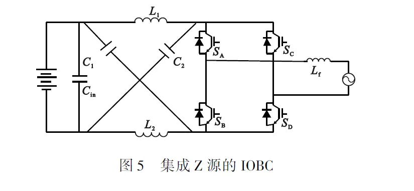 文献提出了一种改进的Z源IOBC,如图5所示。当能量由电池侧通过准Z源网络流向电机时,准Z源网络可以实现升压功能,当能量由电机侧流向电池侧时,准Z源网络可实现降压功能。在此基础上,文献利用了电机绕组充当滤波电感与准Z源变换器共同实现了车载充电功能。由于Z源阻抗网络中使用的电容较大,功率开关管承受的电压应力也很大,因此该方案可以实现宽范围电压充电,但是对器件的要求较高。