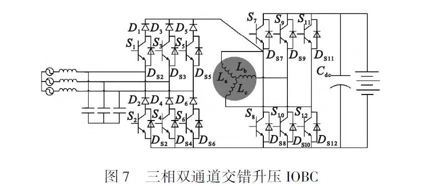 文献提出的三相IOBC如图7所示。通过附加三相接口直接连接到电动汽车驱动系统,集成方法简单,无需对驱动变换器进行任何调整。相比较于图6的结构,图7的充电功率更高。但输入电流质量不高,THD高达4.77%,同样两级结构的存在导致充电效率不高,最大效率为92.6%。