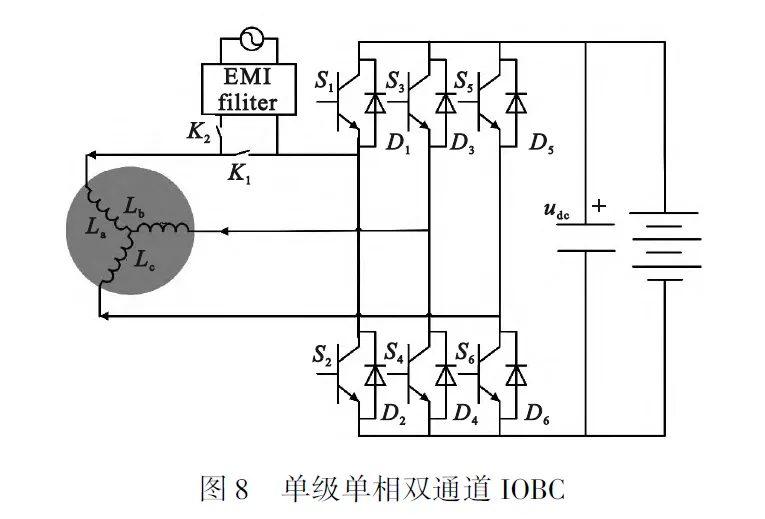 相比上一小节提出的IOBC,电机绕组和驱动电路实现AC/DC功能的车载充电器无需额外的整流环节,所需要的功率器件更少,集成度更高。文献研究了三相永磁同步电机定子绕组与驱动变换器集成时的绕组配置方案,分析了不同转子位置下电流与转矩的关系,通过控制流经绕组的电流,实现充电时的零转矩保持。文献将三相永磁同步电机定子绕组分别与驱动电路三个桥臂中点和单相电源相连,如图8所示。充电期间,K1断开,K2闭合,永磁同步电机的a相绕组连接到单相电网的一侧,而逆变器的a相支路连接到另一侧,在充电过程中保持电机零转矩的控制方法与图6一致,这里不再赘述。此外还研究了三相永磁同步电机定子绕组作为滤波电感充电时电感值变化所带来的输入电流谐波增大和系统相位裕度下降的问题,并针对这两个问题提出了P-DR控制器和自适应P参数的控制策略。