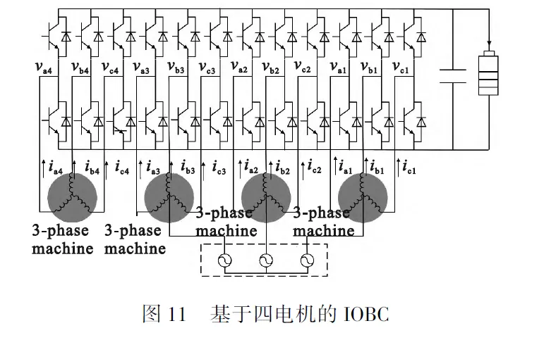 文献将四台电机与驱动器变换器进行,如图10所示。在驱动模式下四个电机独立运行,由一个蓄电池通过四个驱动变换器向电机供电。在充电模式下,三相电网直接连接到三个电机定子绕组的中点,通过同时驱动同一电机相连的驱动桥臂,可以保证每个电机内的三个绕组流过相同大小的电流,因此产生的旋转磁场相互抵消,从而保持电机零转矩充电。该配置通过交错控制减少电流纹波,且能够实现V2G功能,然而,电机定子绕组构成的等效滤波器电感值较小,需要添加额外的滤波电感。文献[36]提出了另一种基于四个电机的单相IOBC,其中两个电机定子绕组与驱动变换器两个桥臂共同构成整流器,另外两个绕组与两个驱动变换器共同构成DC/DC变换器,用于控制输出电压,具有很大的实际应用价值。文献提出了一种基于双电机系统的IOBC,通过对驱动变换器的改造,使其在充电时电机保持零转矩。但需要对电机绕组重新配置,且需要额外的功率开关。