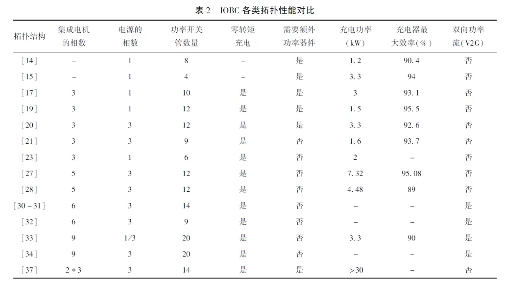 本节根据IOBC所集成电机的相数、电源的相数、功率开关管数量、是否需要额外的功率器件等八个方面对所列出的拓扑电路进行比较,结果如表2所示。