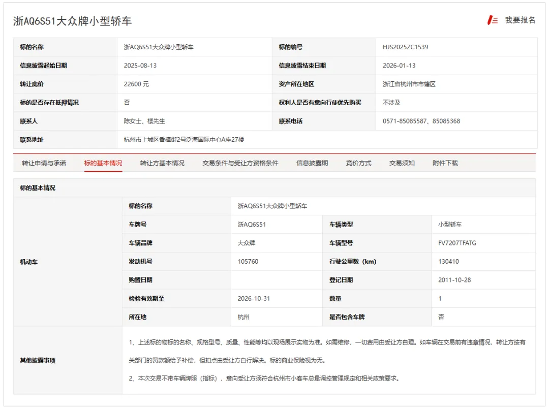 标的名称:浙AQ6S51大众牌小型轿车