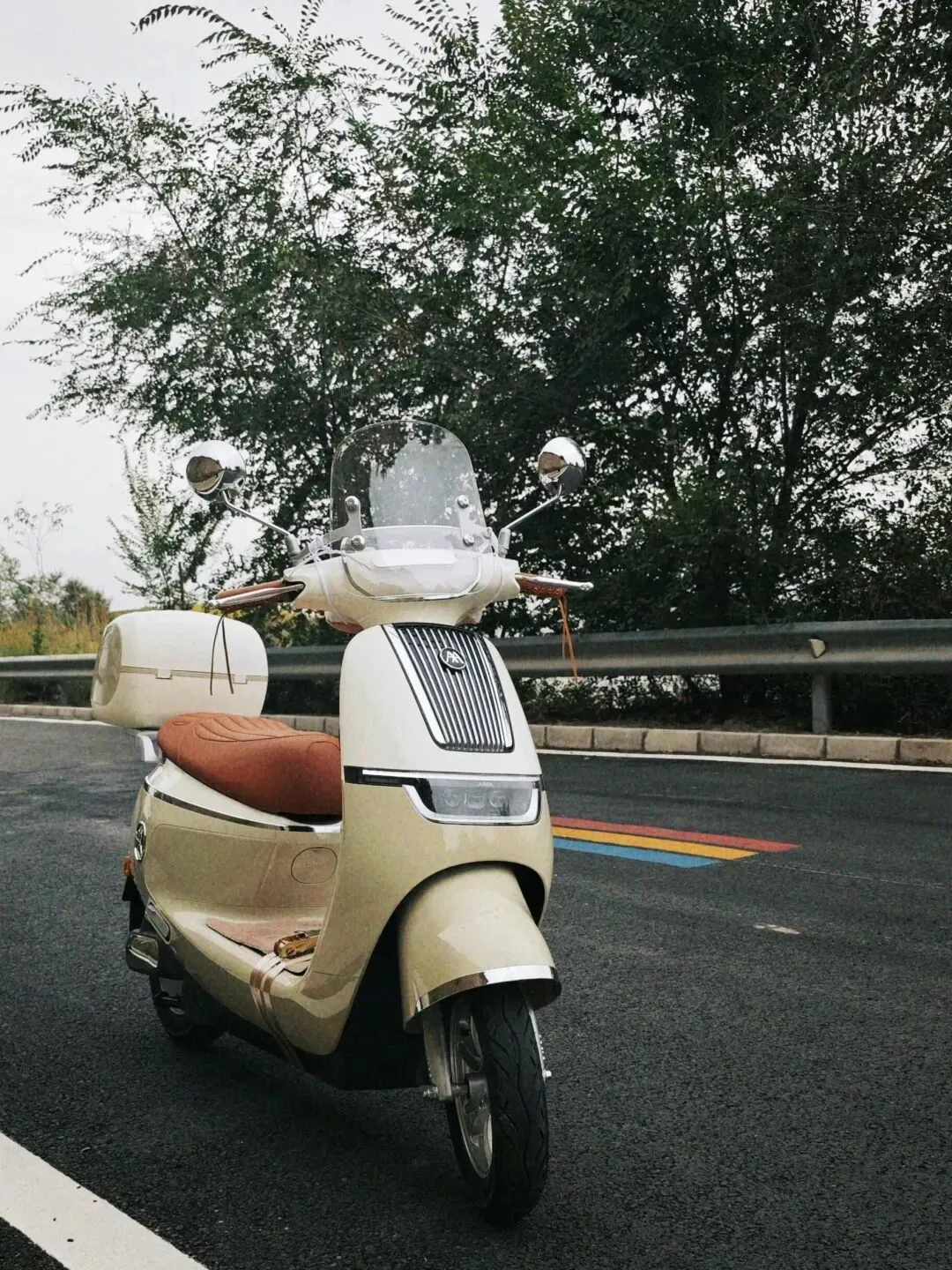 我用手抠了下坐垫边缘,是真皮纹那种皮,但是厚度一般。储物空间嘛,也就放个包和雨衣差不多,多一个大瓶水可能就顶了。就是那种你上楼拿不累,下楼扛得动的类型。它后视镜现在新版国标推荐装上,爱玛这台标配了,角度挺好调,这个细节我挺满意。