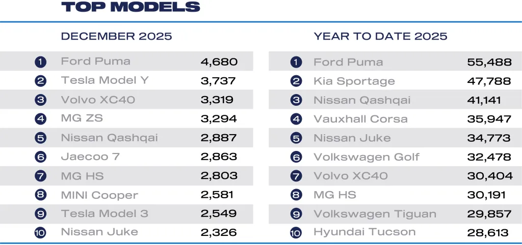 最受欢迎的十款车型分别是福特Puma、起亚狮跑(Sportage)、日产逍客(Qashqai)、沃克斯豪尔Corsa、日产Juke、大众高尔夫、沃尔沃XC40、名爵HS、大众途观(Tiguan)、现代途胜(Tucson)。最畅销的电动车是特斯拉Model Y,共售出24,298辆,但未能跻身前十。