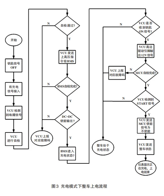 当驾驶员由于疏忽而忘记整车还处于充电状态下时,如果强行启动车辆,这时候 VCU 会在接收到钥匙 ON唤醒信号以后执行上电流程,当收到MCU 反馈给 VCU 的要请求使能信息时,要能立即对此信号作出回应,禁止电机使能。最后能够将充电状态信息发送到仪表盘,使驾驶员能够看到整车充电信息,便于驾驶员掌握整车的充电状态。整个流程如图3所示。