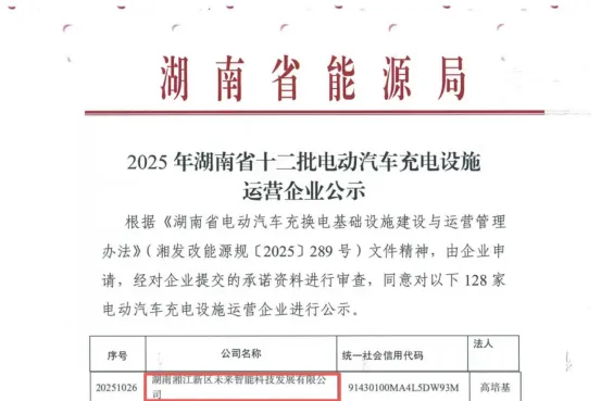 1月8日,湘江智能公司旗下控股子公司湖南湘江新区未来智能科技发展有限公司(以下简称“未来科技公司”)正式通过湖南省能源局备案,成功取得电动汽车充电设施运营资质。此次获得电动汽车充电设施运营资质,标志着湘江智能正式进入充电基础设施投资运营领域。