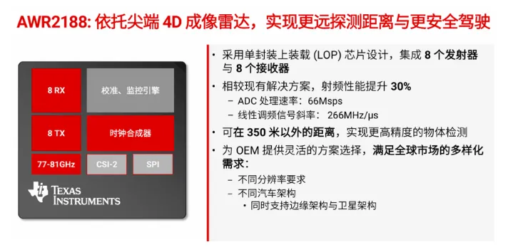 在此背景下,AWR2188单芯片8x8收发器的推出,通过高度集成化设计与灵活的级联能力,为解决上述挑战提供了关键支撑,推动4D雷达成像技术从实验室走向规模化量产。