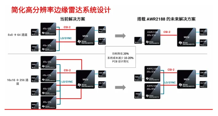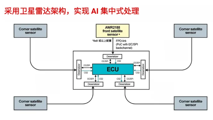 随着汽车电子电气架构从分布式向集中式演进,雷达系统也正从传统的边缘处理架构向卫星雷达架构过渡。AWR2188前瞻性地支持这两种架构模式:在边缘处理架构下,芯片可独立完成信号处理、目标检测与追踪,直接输出目标信息,适用于低成本的分布式感知方案;在卫星雷达架构下,AWR2188作为远端传感器,将采集的原始数据流通过高速接口传输至中央ECU,由中央计算单元进行集中处理与多传感器融合。