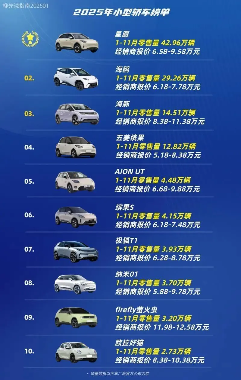 根据2025年1月至11月的零售数据,中国小型纯电轿车市场形成清晰的竞争格局。年销量已经突破10万台的车型包括吉利星愿、比亚迪海鸥、比亚迪海豚以及五菱缤果。其中,吉利星愿,在11个月内累计零售量达到42.96万台。它结合了时尚设计、智能科技和亲民价格,满足了年轻家庭和都市白领的多重需求。同时,吉利强大的渠道和服务网络为销量提供了支撑;排在榜单第二、第三的海豚和海鸥凭借比亚迪强大的品牌背书、技术的优势和完善的销售服务体系,持续保持热销态势,销量分别达到29.26万台和14.51万台。