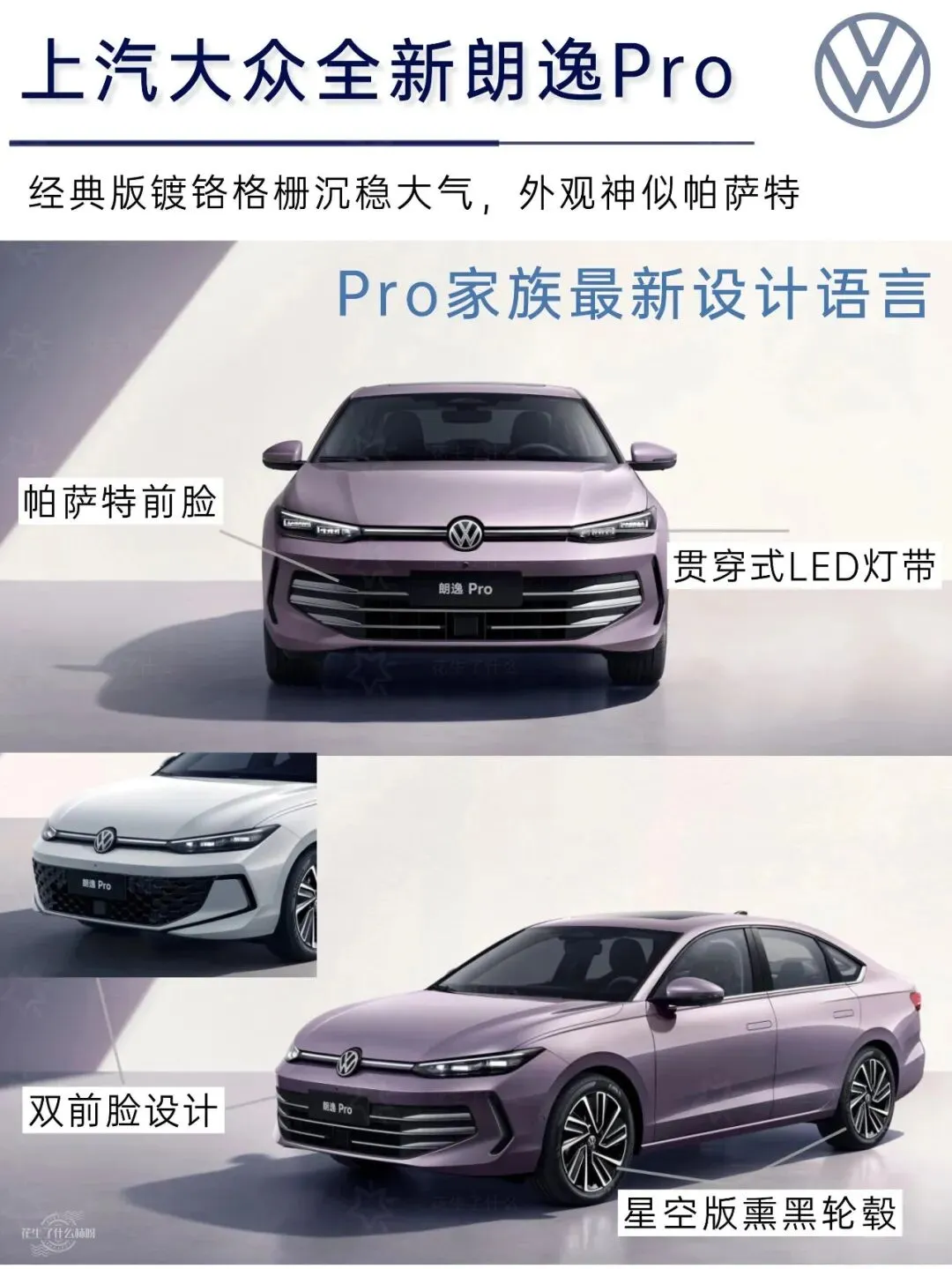 朗逸 Pro 采用 Pro 家族最新设计语言,上汽大众这外观设计,简直太懂国人的审美了!前脸和帕萨特神似,还有星空、经典双前脸可选。经典版的镀铬格栅,沉稳又大气;星空版的熏黑轮毂,时尚感直接拉满。