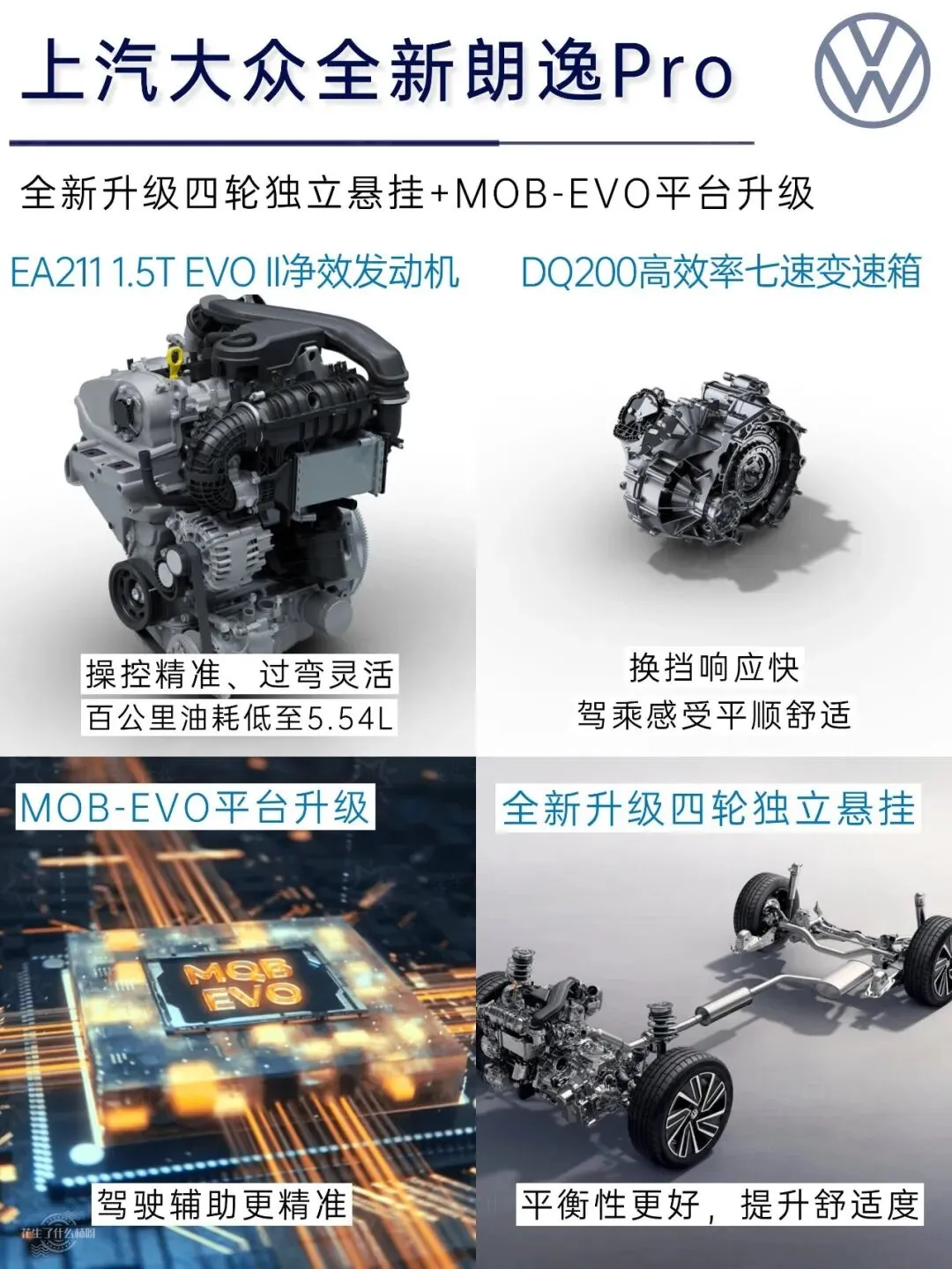 朗逸 Pro 升级了四轮独立悬挂,在这个价位里,德系家轿能做到四轮独悬,性价比超高。搭配 EA211 1.5TEVO II 净效发动机,160 匹马力,起步轻快,加速有力。