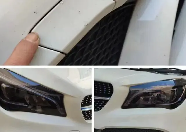 前杠喷漆没错,大灯换过没错,翼子板却是钣金修的,根本没换!