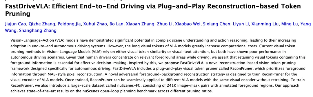 FastDriveVLA 的价值,就在于它通过重建任务,把“重要性判断”这件事,交给了模型自己去学,而不是工程师手写规则。