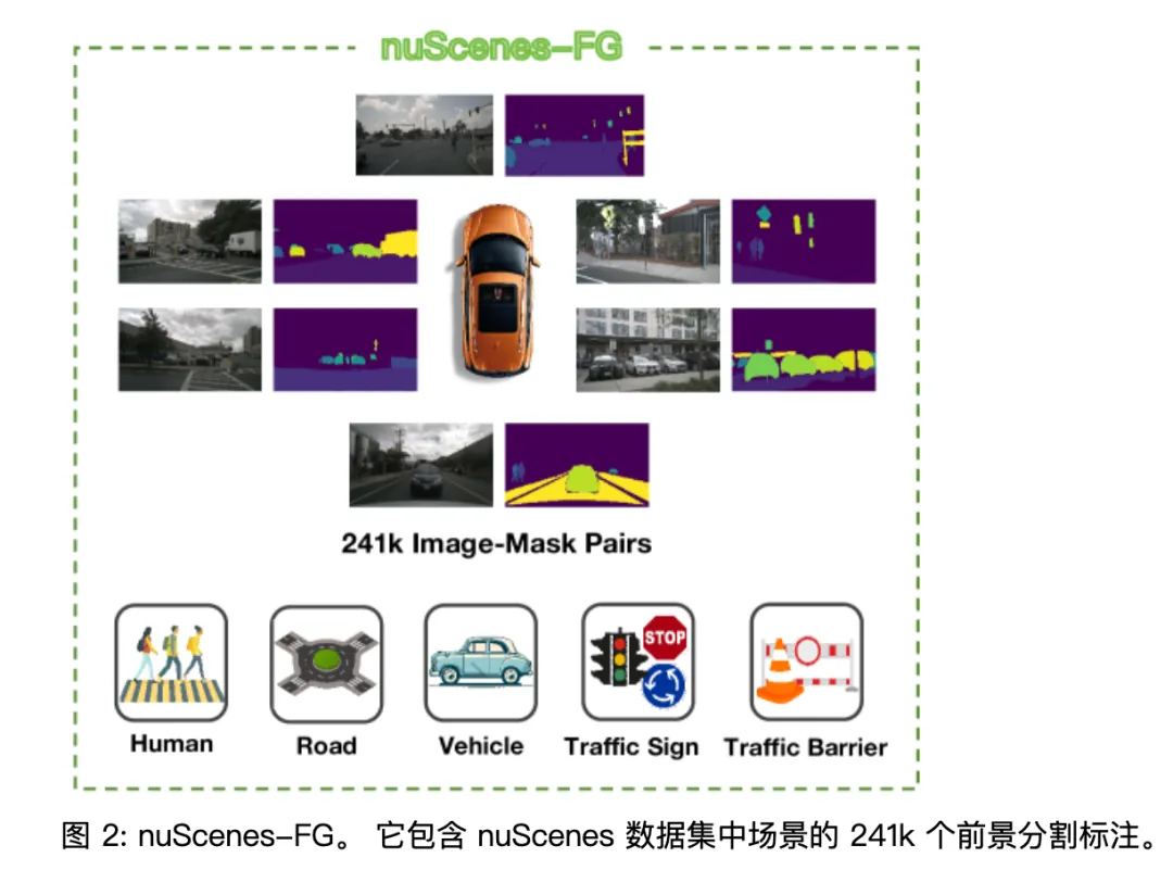 为了把这个“分拣员”训练好,小鹏团队还专门构建了一个新的数据集——nuScenes-FG。他们重新定义了“驾驶前景”的概念:人、车、道路、交通灯、交通标志,统统算前景;天空、树木、远处建筑,统一算背景。然后用 Grounded-SAM 在 nuScenes 上生成了 24.1 万张带前景掩码的图像。