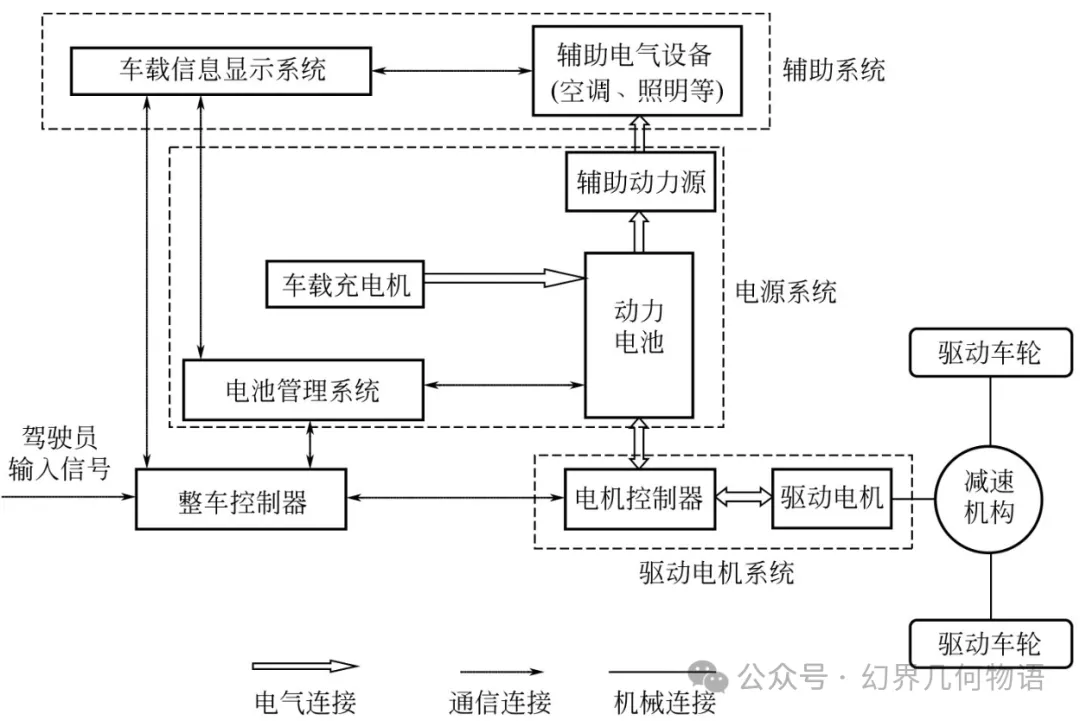 典型纯电动汽车组成如下图所示,主要包括电源系统、驱动电机系统、整车控制器和辅助系统等。动力电池输出电能,通过电机控制器驱动电机运转产生动力,再通过减速机构,将动力传给驱动车轮,使电动汽车行驶。