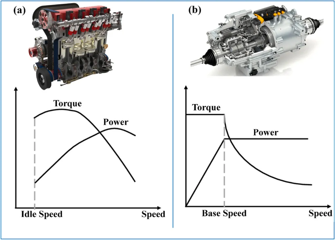 Fig. 2. Torque-power curves for (a) ICE and (b) EV.(注:图 2 对比了燃油车(a)与电动汽车(b)的扭矩-功率曲线。EV 电机能从零转速瞬间输出最大扭矩,且工作转速极高(>10,000 rpm),这使得传动部件长期处于边界润滑或贫油润滑的极端工况。)