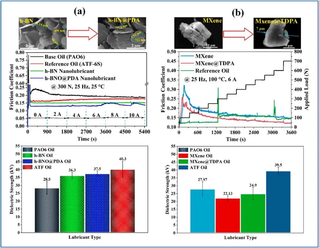 Fig. 8. Performance of h-BNO@PDA and MXene@TDPA nano-additives under electrification.(注:图 8 展示了 h-BNO@PDA 和 MXene@TDPA 两种纳米添加剂在通电条件下的优异表现。左图显示 h-BN 纳米流体具有更高的介电强度(绝缘性好);右图显示 MXene 添加剂在 6A 电流下仍能保持极低的摩擦系数,证明了二维材料在电气化摩擦中的巨大潜力。)