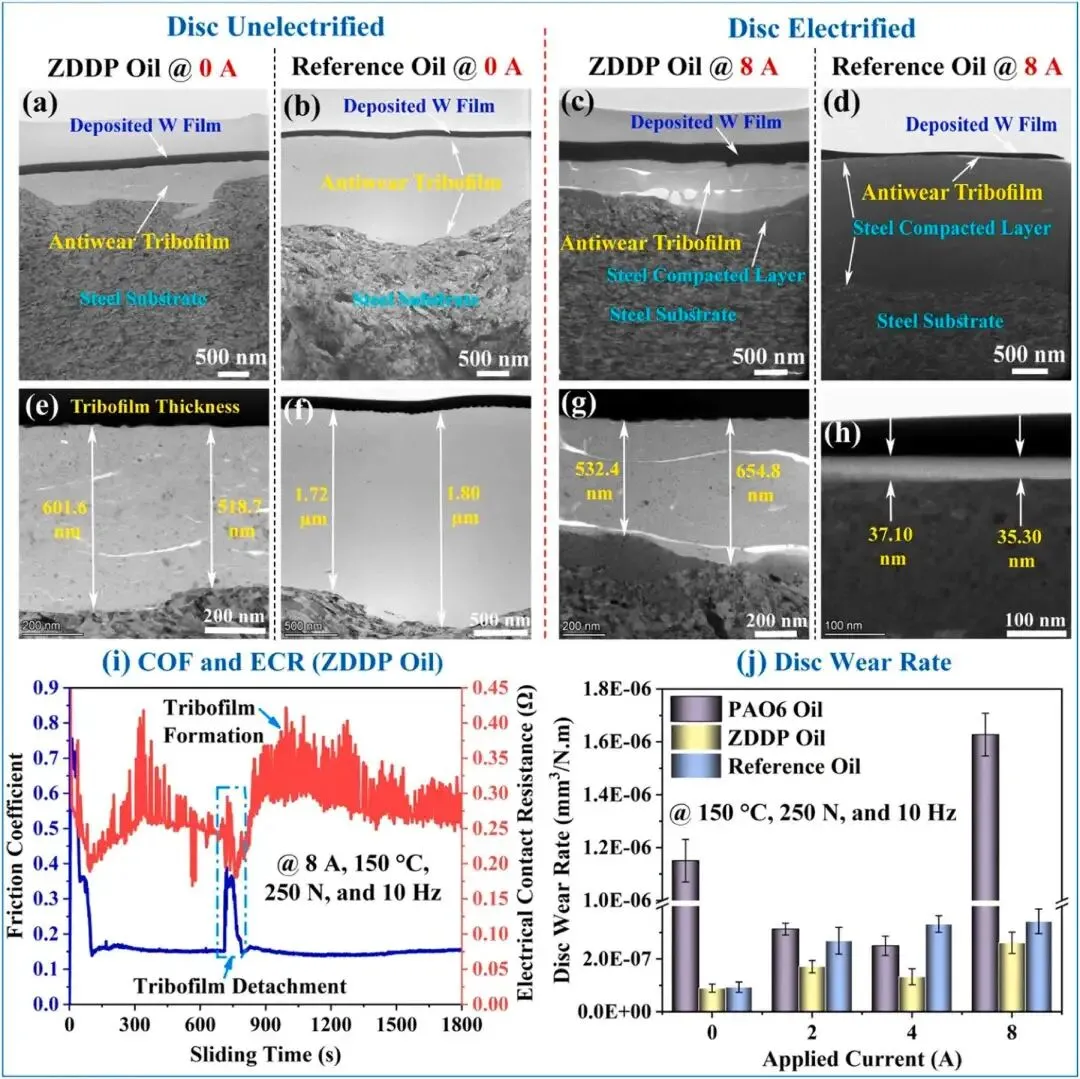 Fig. 9. Microscopic evidence of ZDDP anti-wear mechanism under electric current.(注:图 9 是 ZDDP 抗磨机制的微观证据。对比 (f) 和 (g) 可以清晰看到,在 8A 电流作用下,ZDDP 形成的摩擦膜厚度高达 654.8 nm,远超无电流时的厚度。这层“绝缘铠甲”有效阻断了电流对基体的侵蚀。)