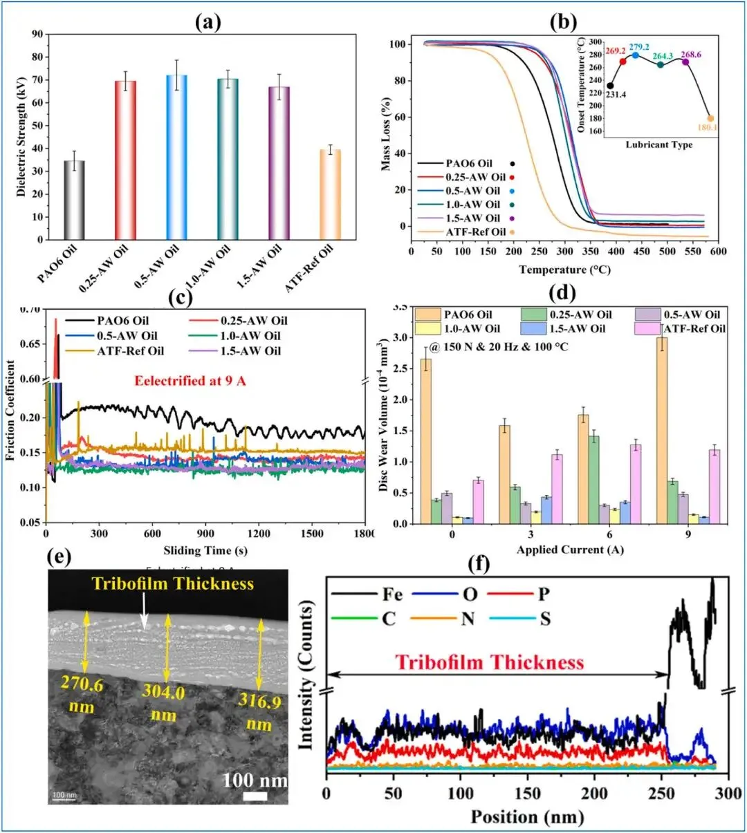 Fig. 12. Performance of novel ashless anti-wear additive AW-6110.(注:图 12 展示了一种新型无灰抗磨剂 AW-6110 的性能。它不仅将介电强度提升了 50%(图 a),而且在 9A 大电流下能将磨损量降低 90%(图 d),且能在表面形成富含氧元素的致密保护膜(图 f)。)