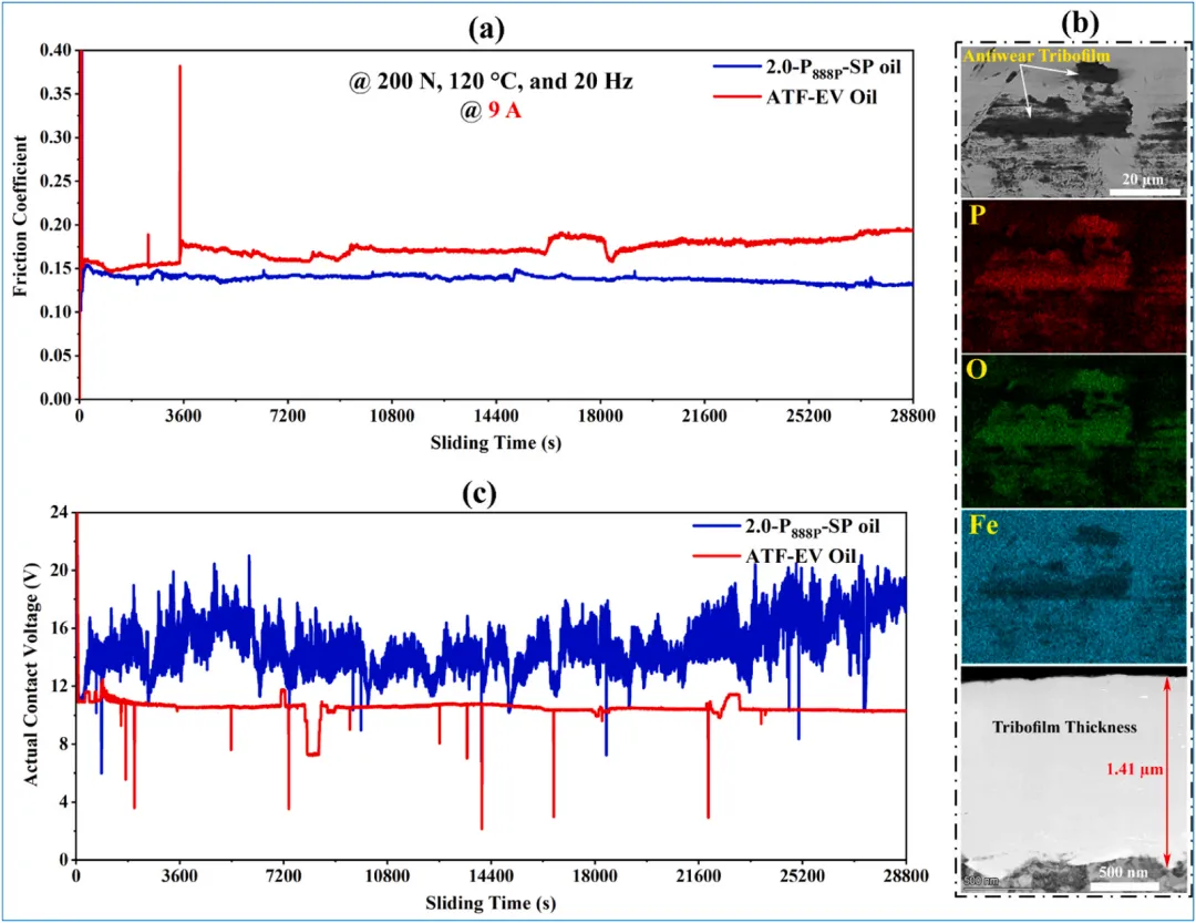 Fig. 18. Stability of P888P-SP ionic liquid under extreme conditions.(注:图 18 进一步展示了 P888P-SP 离子液体在极端工况下的稳定性。在 9A 连续电流下,摩擦系数保持平稳(图 a),实际接触电压的波动(图 c)反映了摩擦膜的动态生成与自修复过程。)