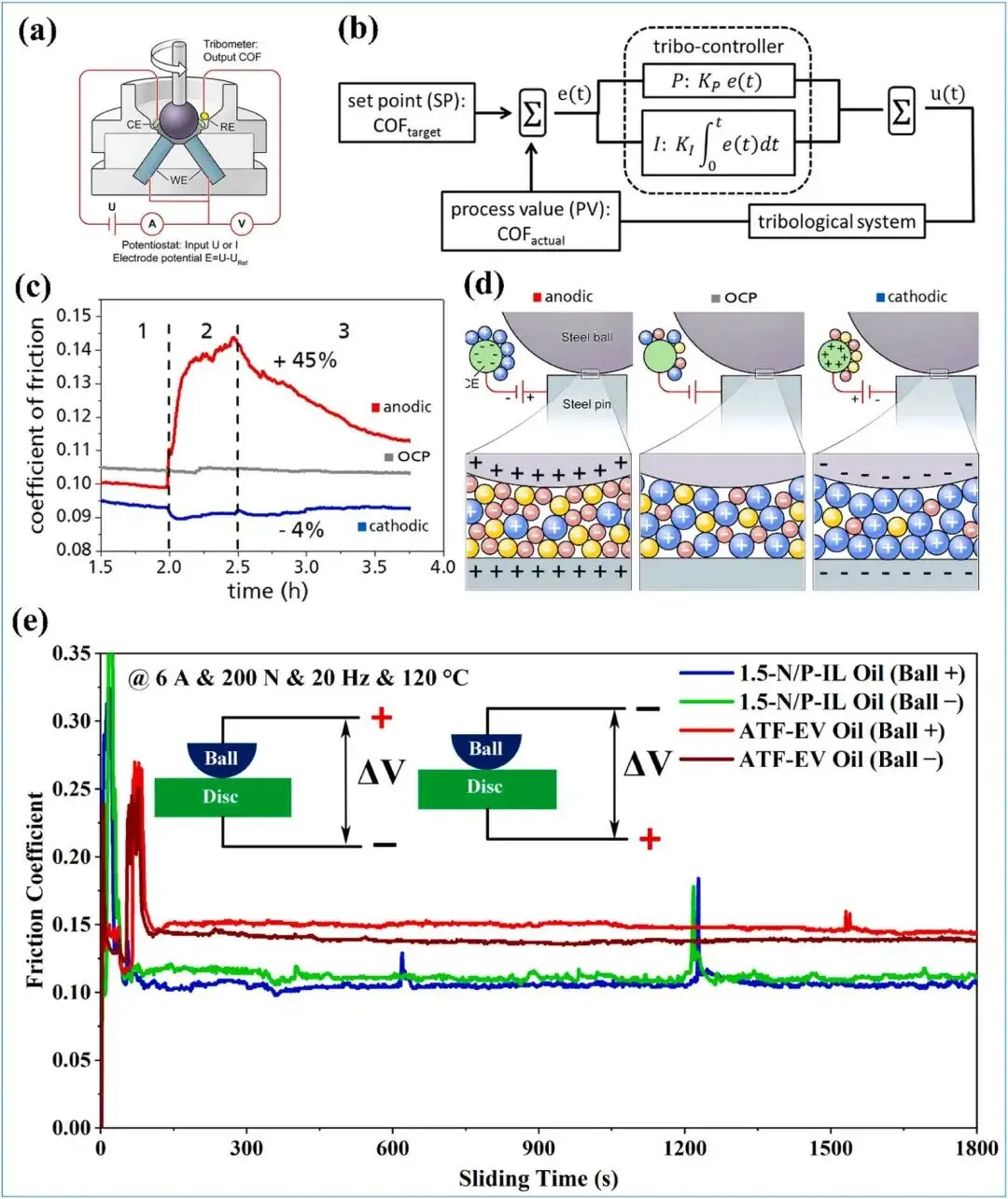 Fig. 13. Mechanism of "electrically controlled friction" with ionic liquids.(注:图 13 揭示了离子液体的“电控摩擦”机理。图 (d) 模型解释了在不同极性电压下(阳极 vs 阴极),阴阳离子在金属表面的吸附构型不同,直接导致了摩擦系数的变化。这为开发“可编程润滑”提供了理论基础。)