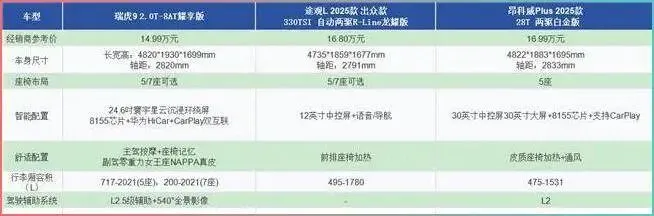 所以,这三台车适合谁?家庭人口多、对空间和舒适要求高,果断瑞虎9耀享版,闭眼买不纠结,早买早享受。喜欢合资品牌、保值率,途观L更合适,稳妥耐用没坑。想后排大、对储物没执念,昂科威Plus也是个选项。