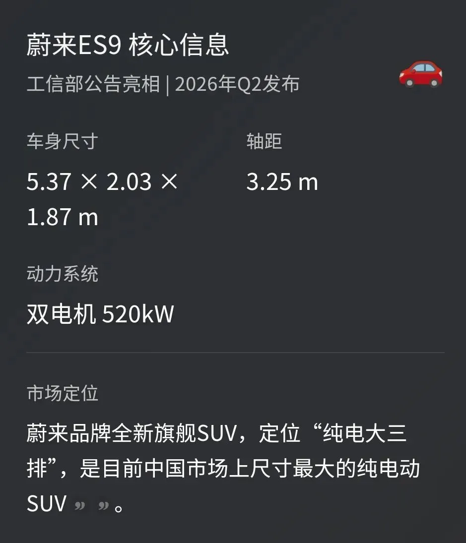 关于价格,目前尚无官方信息。网络上有各种猜测,从“四五十万起”到“70万元级别”不等。合理的预期是其定价将位于ES8和旗舰轿车ET9之间,即50-70万元区间。蔚来官方已确认,ES9计划于2026年第二季度正式发布。