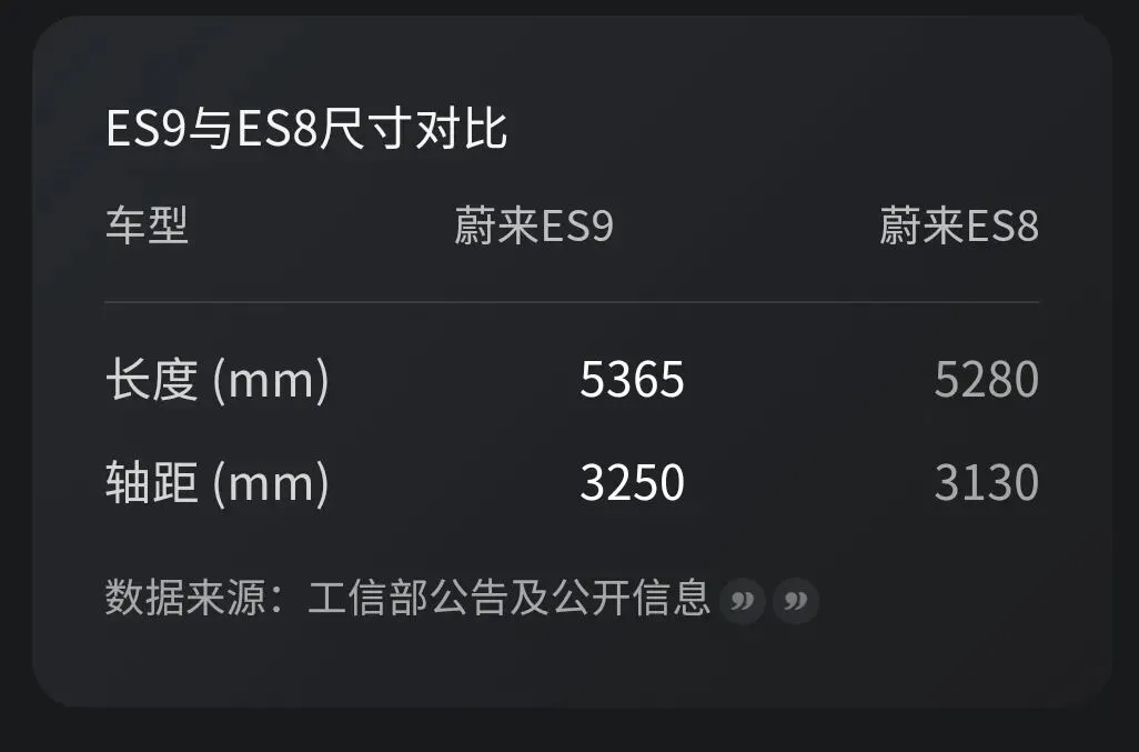 ES9最引人注目的无疑是其庞大的车身。根据工信部数据,其长宽高分别为5365mm、2029mm、1870mm,轴距达到3250mm。这个尺寸使其成为目前中国品牌中尺寸最大的纯电动SUV,甚至超越了部分传统豪华品牌的全尺寸车型。