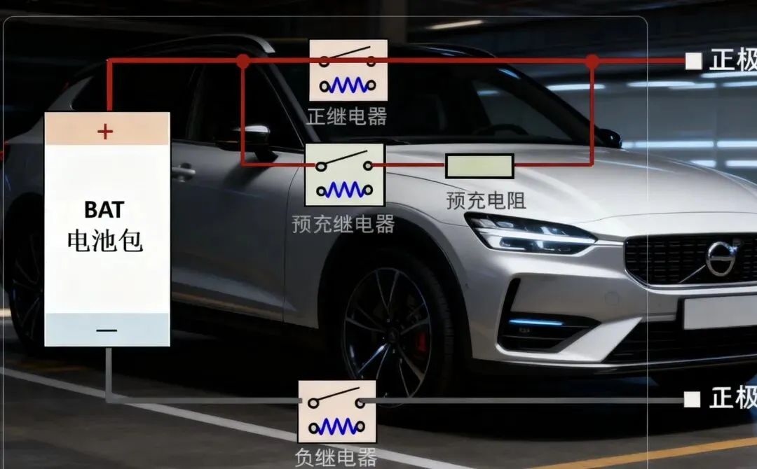 电池输出电路的正、负极回路中,会分别串联主继电器(Relay),用于控制电池与整车电路的通断。由于电机控制器输入端并联了大电容,若直接闭合主继电器,电容上电瞬间会产生极大的冲击电流,极易损坏电池、电容及其他电路元件。为解决这一问题,电池正极电路中,正主继电器两端并联了预充电路,该电路由预充继电器与预充电阻串联组成,上电时先通过预充电路为电容缓慢充电,待电容电压接近电池电压后再闭合主继电器,从而有效规避瞬间大电流带来的电路损坏风险。