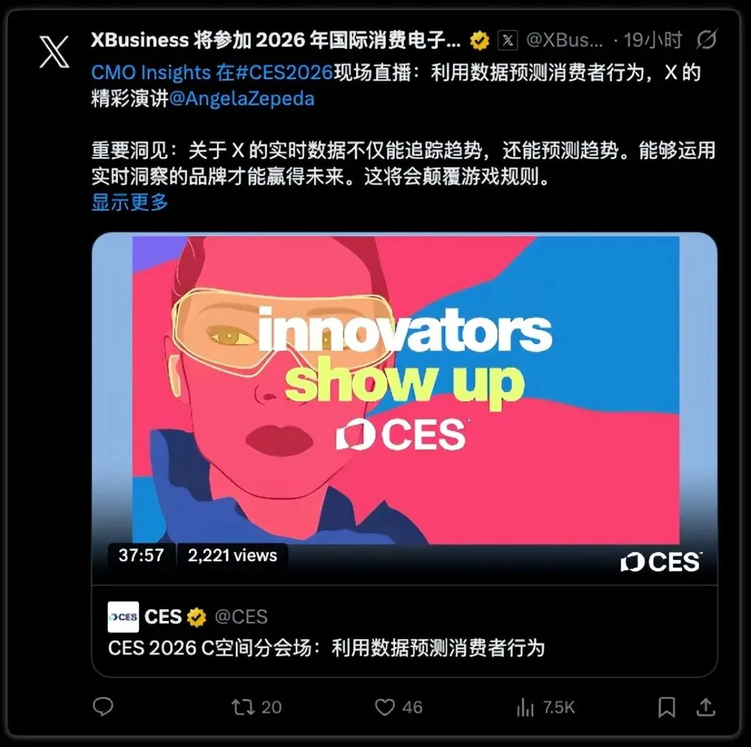 - 在 CES 展会上,X 的全球广告主管 Monique Pintarelli (@Monique_X)和产品负责人 Nikita Bier(@nikitabier)营造了一种亲密的氛围,与客户讨论了平台创新、2025 年在业务拓展方面有哪些突出之处,以及 2026 年即将推出的令人兴奋的新事物。