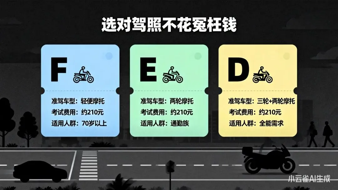 仅能驾驶电动/燃油轻便摩托车,且不能载人。适合70岁以上老人(需通过“三力测试”)或只短途代步的人群。费用和E证差不多,但准驾范围窄,非年龄限制不建议单独考。