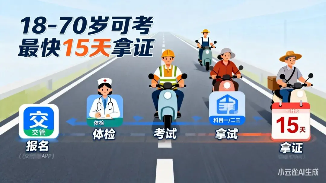 考电动车/摩托车驾照,比考汽车驾照简单太多!报考条件放宽,流程简化到“一站式办理”,最快15天拿证,部分地区甚至能“当天报名、当天考试、当天拿证”。