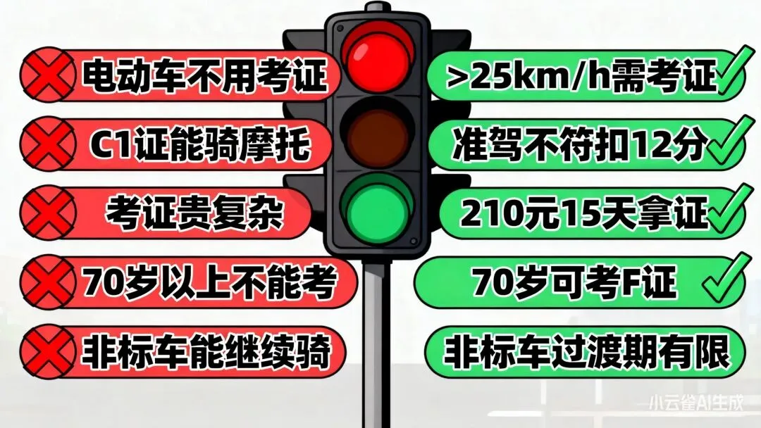 2. 误区二:有C1证,骑电动摩托车没事。→ 错!准驾不符记12分、罚款,C1驾照暂扣。