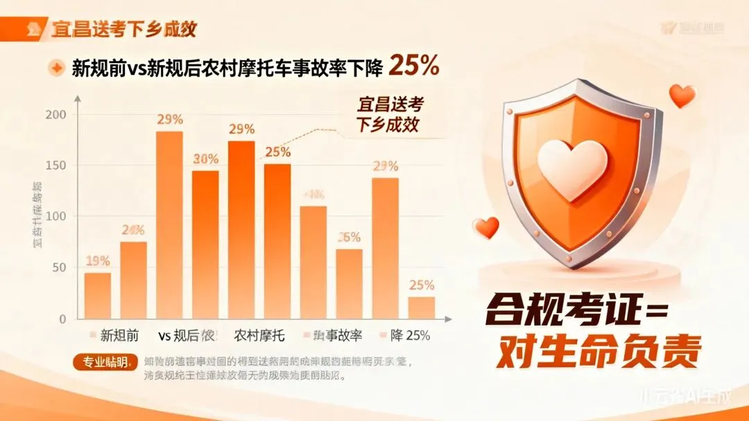 新规的核心不是“为难车主”,而是保障道路安全。宜昌推行“送考下乡”后,农村摩托车亡人事故中无证驾驶比例下降25%。合规考证,既是避免处罚,也是对自己和他人的生命负责。