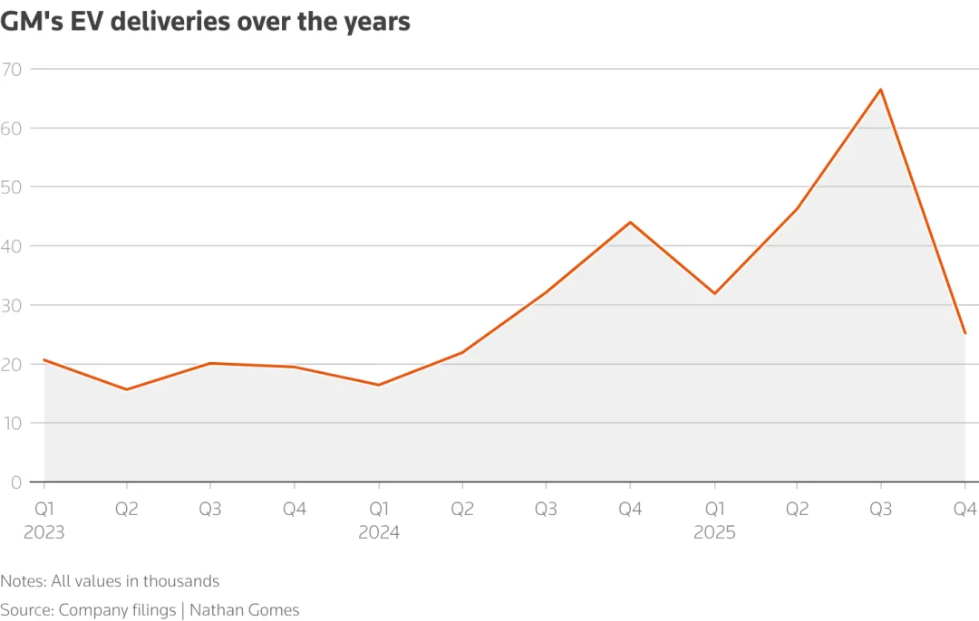 在补贴结束前的几个月,消费者集中提前购车,推动电动车销量短暂冲高;而补贴消失后,销量迅速回落。通用的电动车交付量在第四季度 同比下滑 43%,正是这一变化的集中体现。