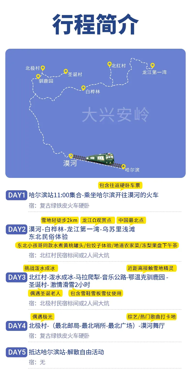 4、门票:龙江第一湾门票+环保车、圣诞村门票、2小时滑雪(含雪鞋/雪板/雪杖使用)、北极村门票、鄂温克驯鹿园;