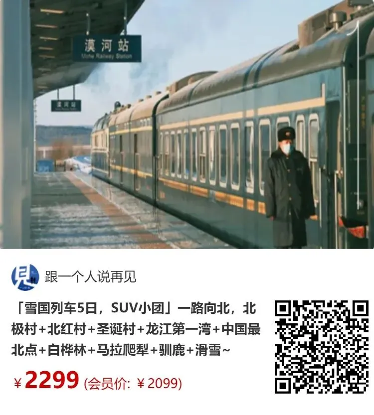 漠河-白桦林雪地轻徒步2km-(150km,车程约2.5小时)龙江第一湾-乌苏里浅滩-(40km,车程约1小时)北红村-东北特色农家菜-包饺子体验-水煮黄桃罐头-冻梨拼盘08 : 00一觉醒来即将到达,小伙伴们可以看看车外的冰雪风景,大家在车上自行用早餐;