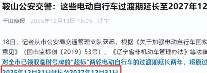 这正是辽宁鞍山公安交警试图避免的局面,他们开出的“诊断处方”看似简单:将超标电动车的过渡期直接延长两年,直到2027年12月31日。起初我判断这只是权宜之计,一种拖延,但细看公告背后的思路,才发觉这更像一场精密的社会压力测试。它并非单纯的时间宽限,而是一个包含明确限制条件的缓冲方案。一边是给车主的钱包和焦虑情绪松绑,另一边则是一个毫不含糊的警告——交警将严查无牌上路、逆行、闯红灯等违法行为。