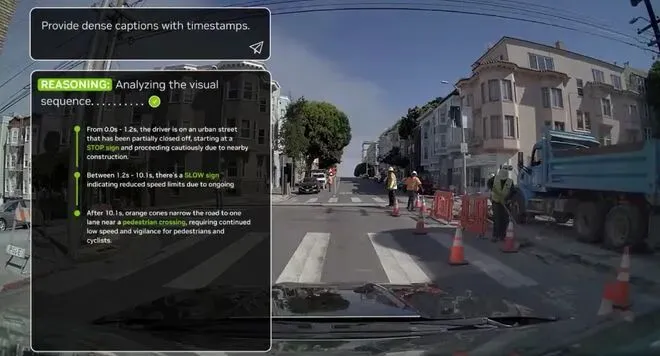 眼前场景极为复杂,当观察到“桩桶/STOP指示牌/路旁行人迈腿动作”除了会减速决策之外,还会推理几秒钟后车辆的方位和需要应对的场景,提前规划避让,还能准确描述决策理由。Alpamayo的“因果链”数据集强化逻辑闭环,这让开发者调优、蒸馏变得可控,让AI变得“受控”。