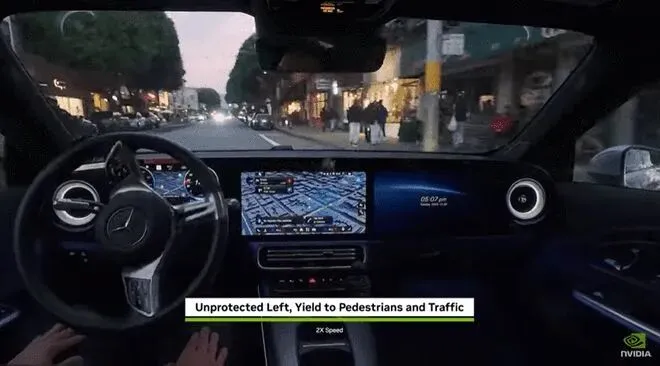 奔驰CLA将会是首部搭载DRIVE AV(应用英伟达Alpamayo 1模型)自动驾驶技术(辅助驾驶)的量产车型,将于2026年第一季度在美国上路,发布会现场播放的演示视频展示着奔驰CLA在美国街区流畅行驶的全程记录,躲避障碍车辆、避让行人一气呵成。