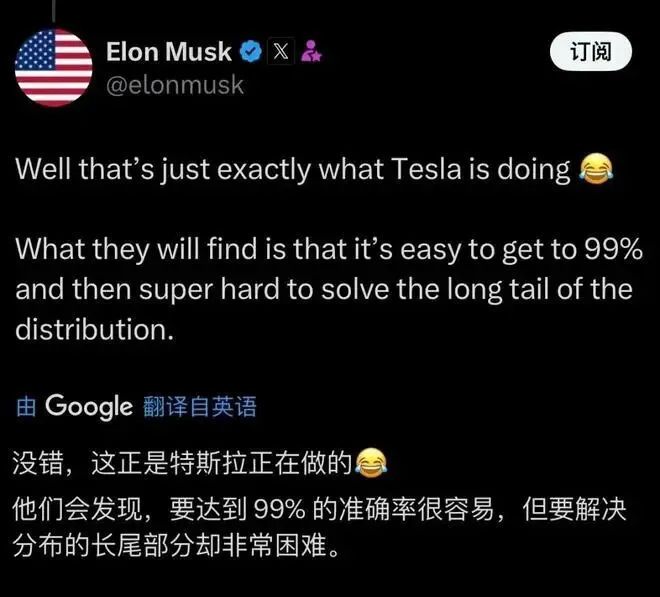 但是即便是再强大的虚拟世界,也会遇到马斯克提到的冗长烦恼的长尾效应。所谓自动驾驶的“长尾效应”是在大量“非标”突发状况下,自动驾驶会因为无法识别路况而失效甚至碰撞,例如:地面的积水反光、静止状态的不寻常见到的非标障碍物(模型无法识别)、一些道路维修造成的车道变更、漂浮不定的塑料袋、在无明显路标指示下的非标道路。