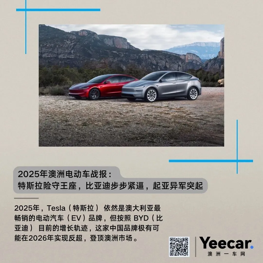2025年,Tesla(特斯拉) 依然是澳大利亚最畅销的电动汽车(EV)品牌,但按照 BYD(比亚迪) 目前的增长轨迹,这家中国品牌极有可能在2026年实现反超,登顶澳洲市场。