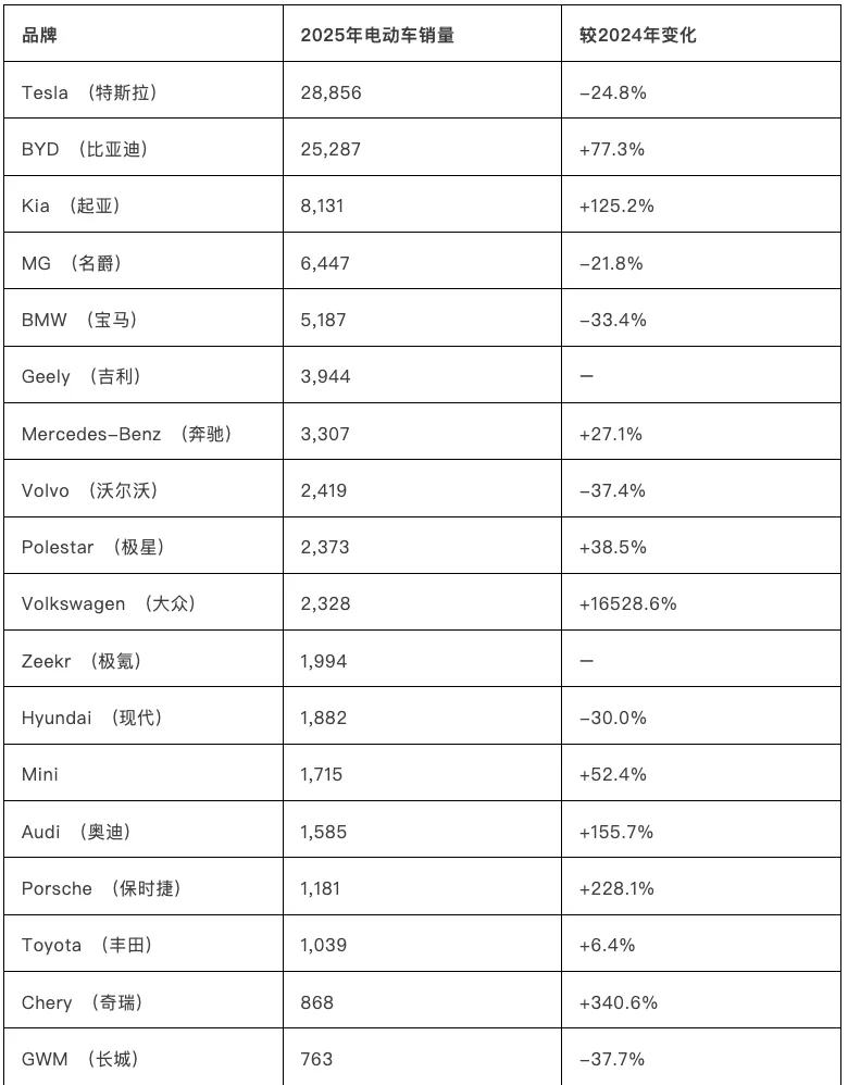 尽管销量下滑了 24.8%,且在全球电动车销量上已被比亚迪超越,但在澳洲本土,特斯拉依然在2025 年保住了冠军宝座。