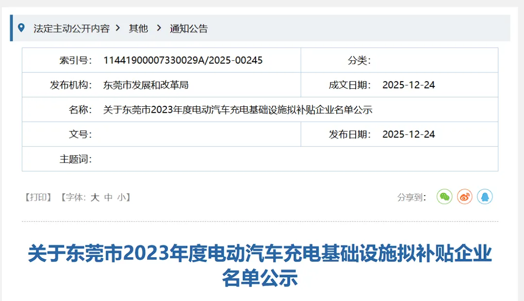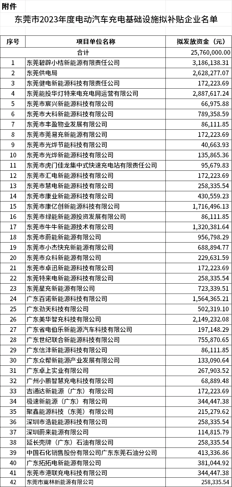 根据《广东省能源局关于做好2023年度电动汽车充电基础设施建设项目核实及奖补资金安排的通知》《关于开展2023年度电动汽车充电基础设施奖补资金申报工作的通知》《关于2023年度电动汽车充电基础设施奖补资金申报工作的补充通知》,东莞市发展和改革局开展了2023年度电动汽车充电基础设施补贴资金申报工作。经网上申报、项目审核、征求意见、第三方机构审查等程序,现将《东莞市2023年度电动汽车充电基础设施拟补贴企业名单》(详见附件)予以公示。