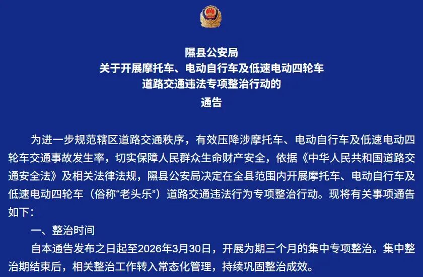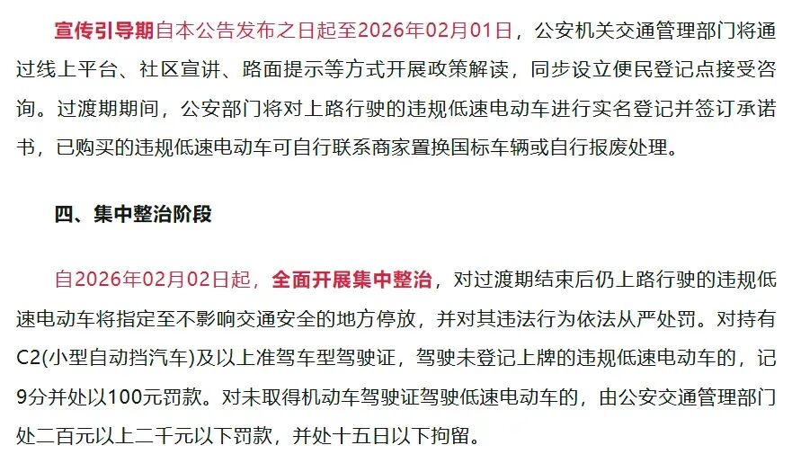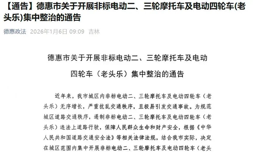 每逢年关,都是全国电动车整治强度最高的时间点,同时也是地方交管部门发布新政策的高峰期,许多车主也在这段时间受到罚款、扣车甚至拘留的处罚。因此,各地正在不断掀起新一轮的整治潮。近期,多地交管部门发布了2026年的电动车新政策。两轮、三轮、四轮的上路检查、充电、牌照等问题都有,一起来看一看吧。日前,吉林省德惠市交通安全委员会发布了《关于开展非标电动二、三轮摩托车及电动四轮车(老头乐)集中整治的通告》,2026年2月1日起,在城区范围内集中开展非标电动二、三轮摩托车及电动四轮车(老头乐)专项整治行动。行动期间,交管部门将严查非标电动二、三轮摩托车及电动四轮车(老头乐)违规上路、逆行、闯红灯、乱停乱放等违法行为。对有驾照依然驾驶非标电动二、三轮摩托车及电动四轮车(老头乐)上路行驶的,依法扣留车辆并依法处罚。对无证驾驶非标车的依法扣留车辆后处500元罚款。对无证驾驶电动四轮车(老头乐)处以2000元罚款。近日,山西省临汾市隰县公安局发布了《关于开展摩托车、电动自行车及低速电动四轮车道路交通违法专项整治行动的通告》,2026年起开展三个月的集中专项整治。行动覆盖2月份,交管部门严查二、三轮摩托车、电动自行车、低速电动四轮车的无牌无证上路、非法改装拼装、闯红灯、逆向行驶、不按规定车道行驶、违法载人载物、驾乘人员不按规定佩戴安全头盔、乱停乱放、违法加装遮阳篷(伞)、“飙车炸街”扰民、酒驾醉驾等突出交通违法行为,并依法处罚。近日,广东省公安厅召开全省公安机关电动自行车摩托车违法专项整治工作视频会议,明确于2026年1月1日起在全省开展为期1年的电摩专项整治行动。广东省一直是电动车整治强度的高峰期,行动期间,交管部门将严查电动车、摩托车的违规违法行为,包括无牌无证、改装加装、酒驾醉驾、不戴头盔、闯红灯、逆行、超载、等行为,并依法处罚。根据贵州省毕节市金沙县公安局、市场监督管理局、交通运输局等多部门联合发布了《关于开展低速电动车道路交通秩序专项整治的公告》,2026年2月2日起在全县范围内全面开展低速电动车集中整治工作。行动期间,交管部门将针对全县范围内的违规低速电动车开展严查,重点整治车辆无牌无证、改装加装、闯红灯、逆行等违规违法行为,并进行依法从严处罚。公告明确,有证驾驶未登记上牌的违规低速电动车的,记9分并处以100元罚款。无证驾驶行为,处200-2000元以下罚款,并处十五日以下拘留。近日,甘肃省张掖市甘州区小满镇政府组织应急办、执法队开展飞线充电专项检查行动。行动期间,执法人员全面摸排16个村电动车保有量,对全镇已架设的九处集中充电桩和安装的2736个充电盒进行全面排查并进行整改,同时严查电动车飞线充电,并全面构建飞线充电整治长效机制。2026年初,全国各地交管部门将陆续执行新一轮电动车管理政策,尤其在2月春节期间,受务工返乡潮的影响,地方电动车管理强度会出现明显提升,特别是针对电动车的非法运营行为,依法严查严罚。