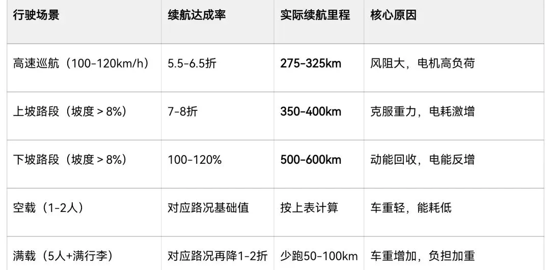 7-8折,实际能跑350-400km。要使劲爬坡,电机额外发力,电耗比平路高30%-50%。