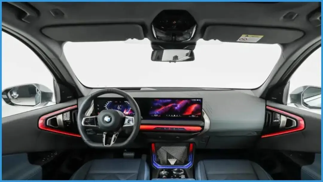 进入车内,宝马X3的取向很明确——空间与驾驶视野优先。前排坐姿较高,视野开阔,头部空间也比较从容。相比以往,这一代内饰在氛围营造上明显更“年轻”,不规则氛围灯点亮后存在感很强,夜间效果尤为突出。双联屏依旧是熟悉的配方,12.3英寸液晶仪表加14.9英寸中控屏,显示效果和尺寸都不输同级。不过造型是否好看就看个人审美了,直角边框确实不算柔和。车机搭载第9代iDrive系统,流畅度和逻辑优化到位,支持QuickSelect快选、语音唤醒以及AI交互。无线充电、USB与Type‑C接口齐全,但目前仅支持CarPlay,安卓用户需要等待后续OTA。