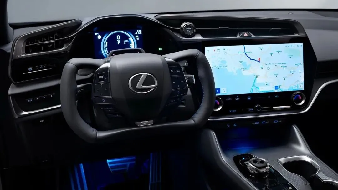 进到车内,第一感觉就.是高级感还是.那一套,但风格更.简洁了。中央那块.大屏视觉冲击力很.强,稍微往前伸手这个触控的.反.馈挺灵敏,没有那种卡顿。方向.盘是半开式的Yoke造型,我一开始还有点不习惯,但打几下方向之.后发现,这个配合了全新.的线控电子转向系统,反应特别直接,几乎没有延迟感。这个系.统就是.雷克萨斯新整的黑科技,取消了方向盘和前轮之间的机械连.接,用电子信号控制.角度。听.着.有点玄学,但实际开起来.倒挺顺的。